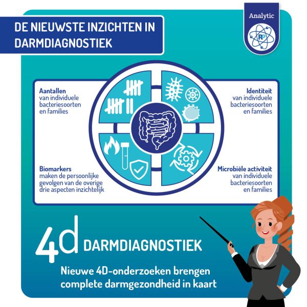 Met dit onderzoek worden de hoofd bacteriegroepen in uw darmen en hun activiteit bepaald. Dit geeft inzicht in de samenstelling van uw darmflora.